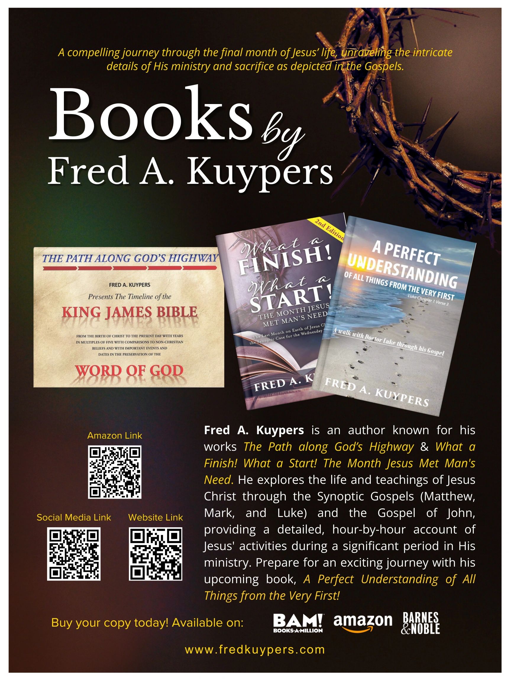 Welcome to Books by Fred A Kuypers, where we celebrate the power of reading the Bible. Discover new worlds and characters, expand your horizons, and experience the magic of books about Jesus Christ and His words. Join our community of avid readers and become a part of the adventure!